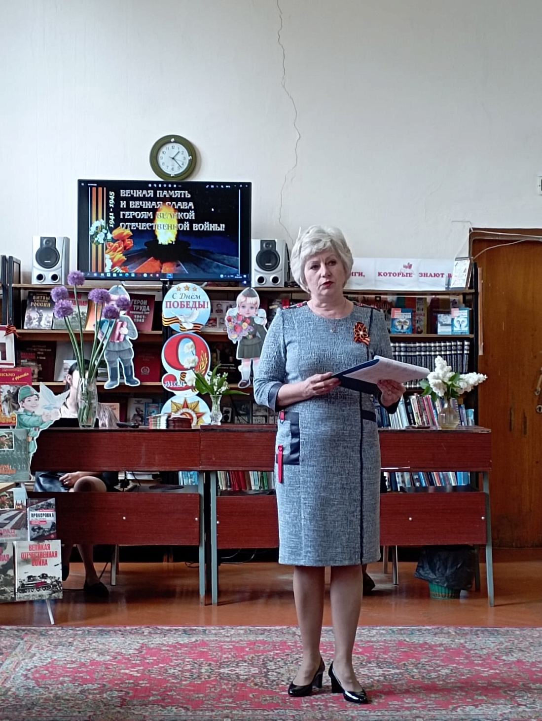 Ведущая рассказала гостям о трудном военном времени, о подвигах наших солдат, о тружениках тыла, о детях-героях, принимавших участие в боевых действиях. Присутствующие посмотрели видеоролики о войне. Вспомнили земляков-героев Советского Союза, уроженцев Кореневского района.