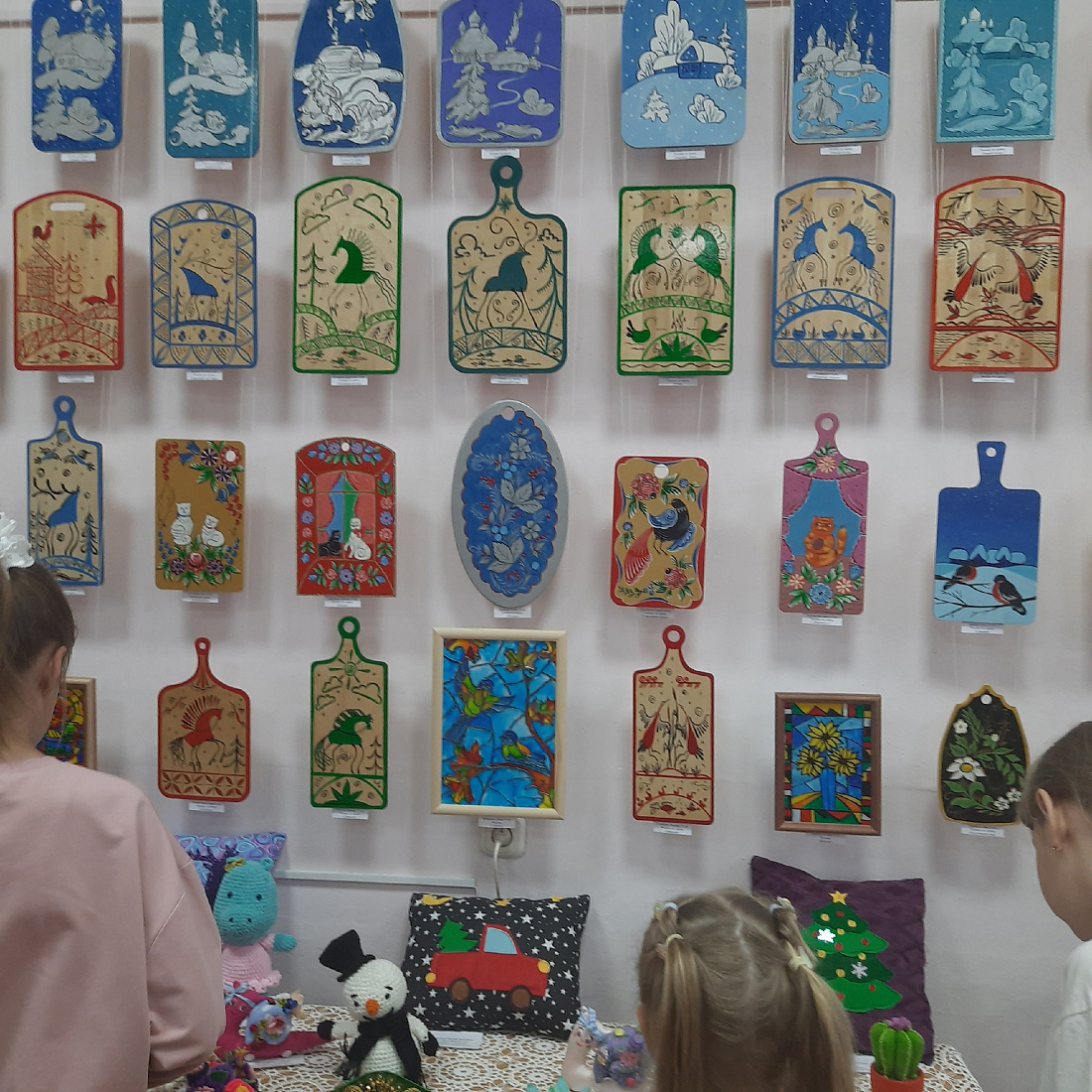 Своё мастерство на выставке демонстрировали не только ученики, но и педагоги. Из увиденных работ можно выделить известные нам всем техники: вязание, роспись по дереву, изделия из фоамирана, поделки в технике квиллинг, картины нитями. Многие из этих работ по праву могут стать украшением музеев декоративно - прикладного искусства.