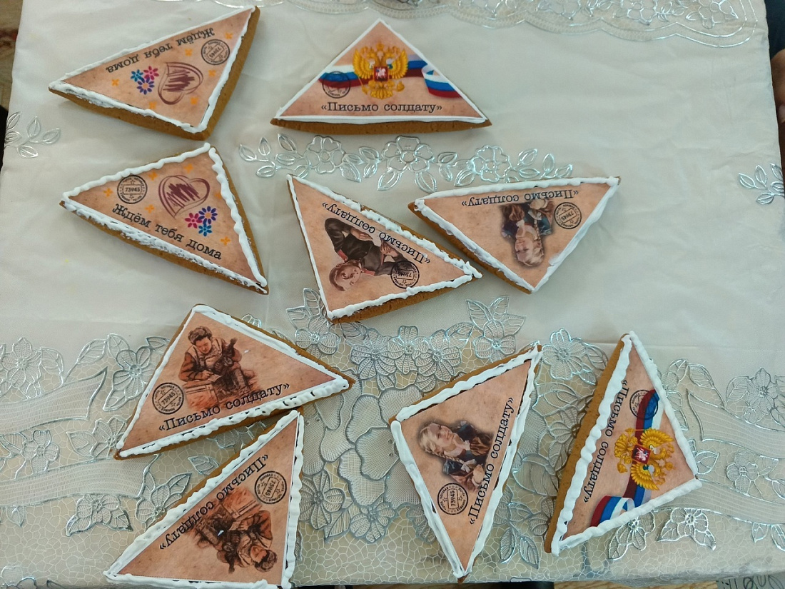 Приготовленную волонтером, многодетной мамой Светланой Савинкиной партию имбирных пряников женщины расписали кондитерской глазурью, превратив каждый из них в подарок ручной работы. Более полусотни ароматных пряников в виде писем, голубей и открыток отправлены нашим защитникам на передовую.