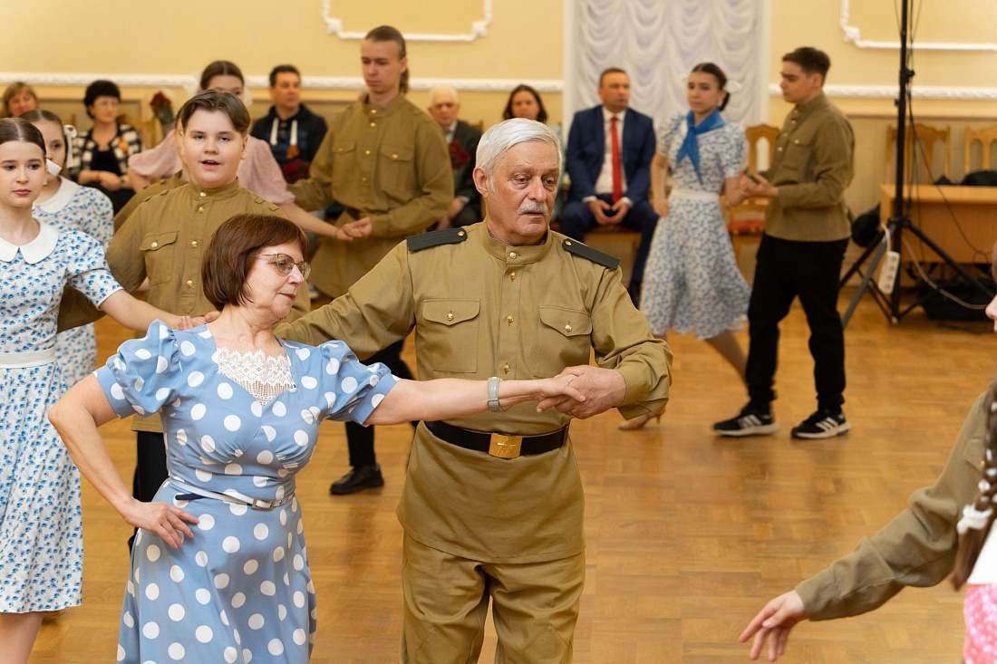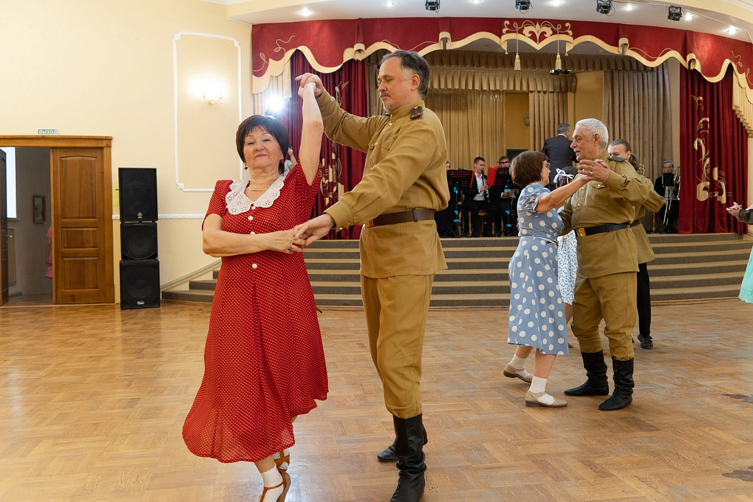 В вихре любимых исторических танцев под звуки музыки военных лет в исполнении духового оркестра и непревзойдённый вокал приглашённых артистов на паркете закружились десятки танцующих пар, одетых по моде 40-х годов.