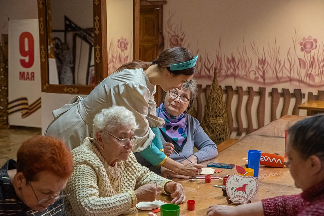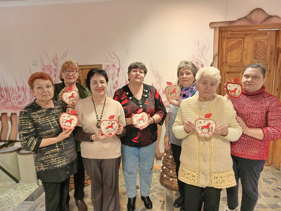 Виктория Владимировна познакомила гостей с основными техниками русской народной росписи и значением славянских символов. Курянкам «серебряного» возраста предложили изобразить на своих изделиях коня – символ счастья и благополучия.