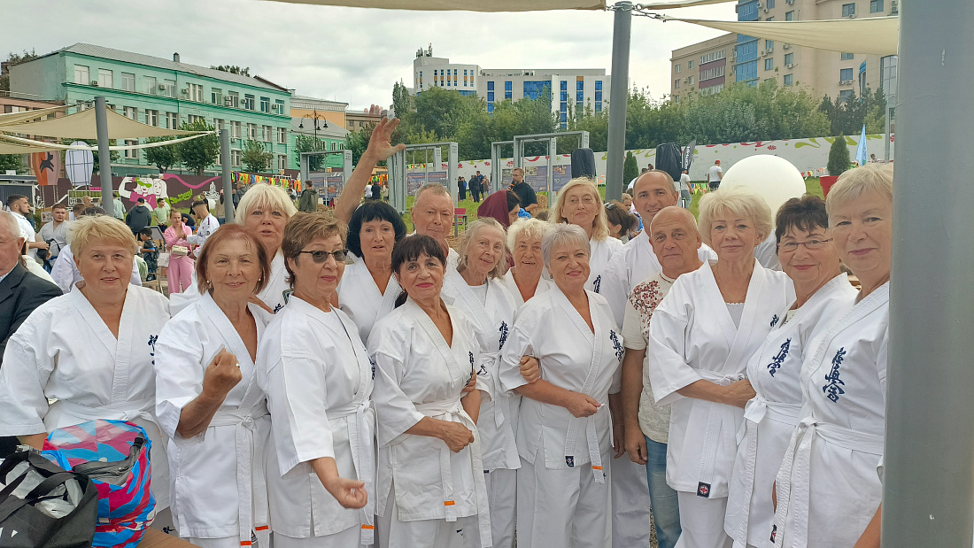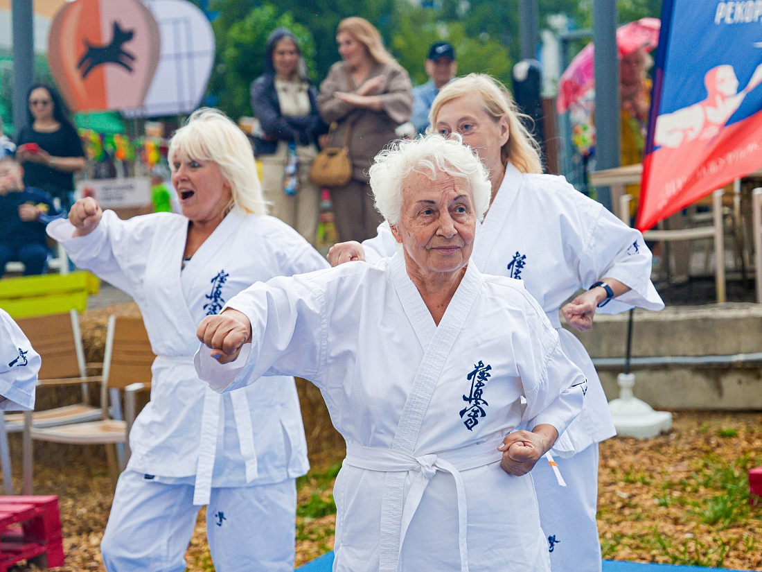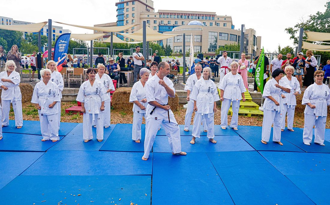 В общественном пространстве "Полугора" состоялся спортивный праздник, посвященный Дню физкультурника, в котором приняли участие активисты проекта «Курское долголетие», занимающиеся киокусинкай.